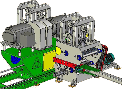 The cants are not steered nearly as much by the curved canter as the wiggle box, because you can hold the cant much more securely. Also, flares and rough logs don’t have as much effect on the curve canter as the wiggle box due to the relative size and power of the chip heads and support. The balancing the chip depth, limit chip depth, step out for max chip depth, pad board, etc. programming mainstays of the wiggle box are not required . With a curve canter the gang saw can run a much smaller gap than a wiggle box, which allows more throughput or a slower feed speed or both. Existing gangs can be used in a curved canter system, which can save a tremendous amount of money.